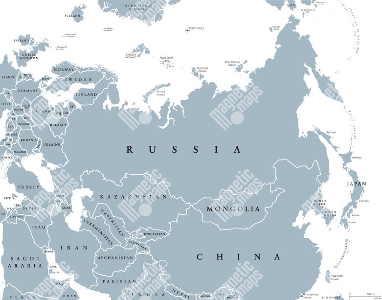 Magnetická mapa Eurázia - Európa a Ázia, ilustrovaná, šedá