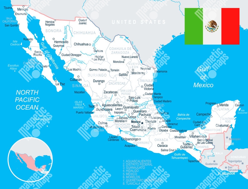 Magnetická mapa Mexika, ilustrovaná, farebná