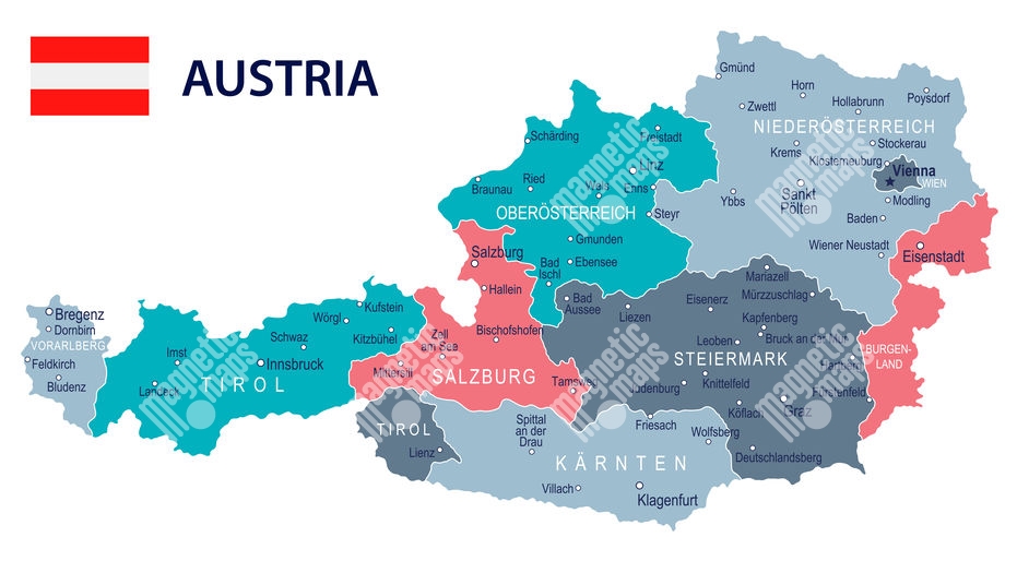 Magnetická mapa Rakúska, ilustrovaná, farebná